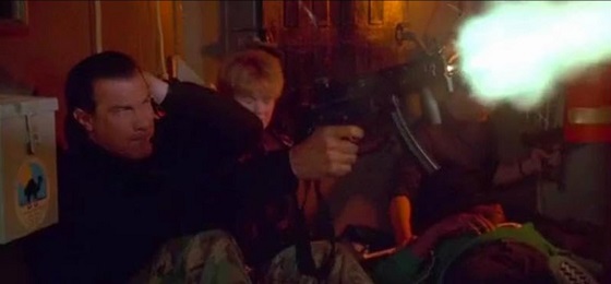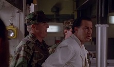 Down in the galley, Ryback is busy prepping the Captains’ birthday meal, when he is rudely interrupted by executive officer Commander Krill (Gary Busey. Lethal Weapon (1987), Point Break 4K), who has arranged for food and entertainment to be brought by helicopter. Ryback isn’t happy with this turn of events, and with a bit of pushing by Krill, Ryback strikes the officer, an offence worthy of the brig, but that would need the Captain’s approval, so Krill has him contained in the walk-in-fridge. A rookie Marine Private, Nash (Tom Wood, The Fugitive, U.S. Marshals) is there to see he doesn’t get out.