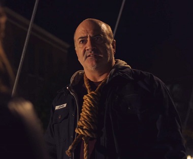 As the film opens we see John (Matt Servitto – Enchanted, Compliance) walking alone in the dark. He’s followed by a strange figure, dressed in a bright orange suit and wearing a very scary halloween mask. He makes a call to his estranged daughter Emma (Lelia Symington – Bury Me Twice) to try and talk to her, but she doesn’t want to know. Seemingly as punishment for his failure, The Jester (Michael Sheffield) in orange forces John to hang himself.